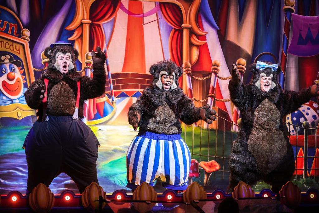 Von Vinklebottom’s plan is to steal the three bears and have them as stars of her show. Paddy and McFetty’s plan is there isn’t one. Only Joey the clown – Adam C Booth whose probably best known for playing multiple comic roles in Keith Lemon’s Lemon La Vida Loca and The Keith Lemon Sketch Show. Booth’s energy is palpable, we were all cheering him on as he both tries to save the circus and win the heart of Goldilocks.
