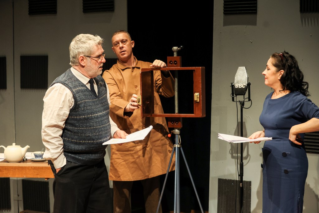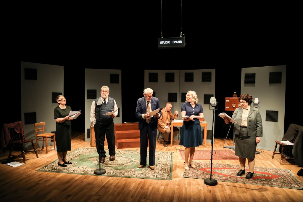 The stage and set is simply a radio recording studio with the actors moving to and fro reading their lines from scripts – though well all know they know them by heart. Produced by Centre Stage Theatre Company and directed by Michael Quinn, this two hours of comedy flies by. We’re treated to a visual view of why this radio comedy compelled such vast audiences to tune into a post-war Northern Irish way of life. The technology may have been basic but the human condition is constant and naturally relatable.