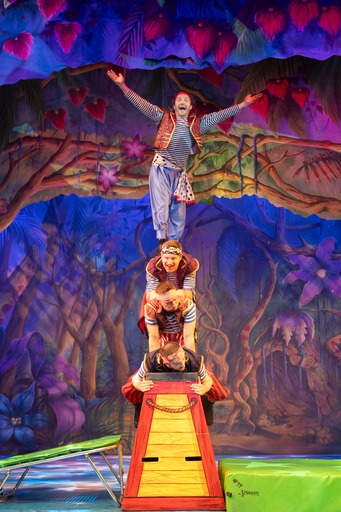 When I say ‘narrrates’ is use the word lightly, the plot is hard to find, but the kids here aren’t looking for well crafted, multidimensional creative story arcs, they just want fits and giggles, and the 19 strong cast do not fail to deliver. For no reason at all there’s a five minute acrobat routine slap bang in the middle of the story. The four man troop called The Acromaniacs, along with McFettridge and Jenkins dazzle to minors with comic demonstration of vault jumoing. Adam C Booth as Smee provides vocabularly gymnastics with the ear-to-ear worthy flag pun scene. That alone is worth the ticket price for the adults, though one is left wondering what the little are left thinking during this two to three minute routine.